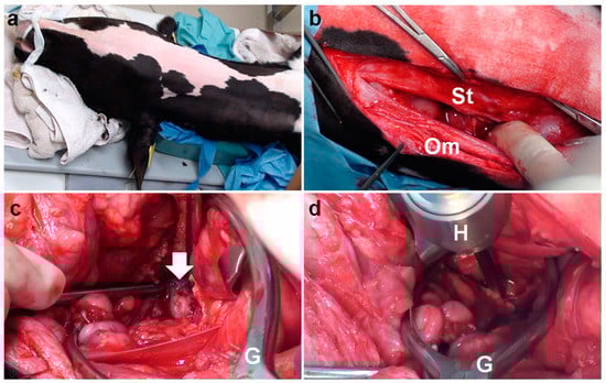 (a) Intraoperative photos of ventral bulla osteotomy in Case 1, positioned in dorsal recumbency with the neck extended. (b) The sternothyroid (St) and omohyoid (Om) muscles are separated under the area of a 15 cm incision. (c) The ventral surface of the tympanic bulla (arrow) is seen as a rounded, irregular structure at the deepest area of the surgical opening, extended using a Gelpi retractor (G). (d) A hand chuck (H) is used to perforate the tympanic bulla.