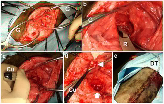 Intraoperative photos of ventral bulla osteotomy in Case 2. (a) Two Gelpi retractors (G) are used to extend the surgical opening. (b) A bone rongeur (R) is used to make a perforation in the tympanic bulla. (c) A curette (Cu) is inserted into the tympanic cavity. (d) The mucoid pus material (arrowhead) is subsequently removed from the perforated ventral surface of the tympanic bulla (arrow) using a curette (Cu). (e) A drainage tube (DT) is secured to the skin with Chinese finger trap suturing.