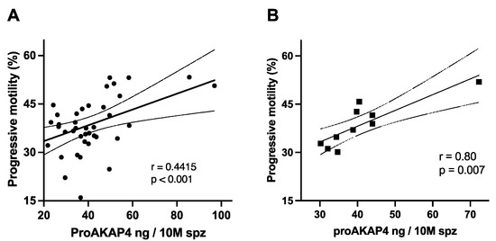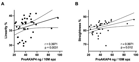 A significant correlation was observed (n = 10, r = 0.80, and p = 0.007) with a calculated linear gain of progressive motility of 5% every 10 ng of proAKAP4 over the concentration of 18.5 ng/10 M of spermatozoa (Figure 2A,B). Assessing the sperm motility descriptors, proAKAP4 concentrations were shown to correlate with the linear and straightness motion of spermatozoa (n = 40, rLIN = 0.39, p = 0.0006 and rSTR = 0.39, p = 0.0001) (Figure 3A,B). ProAKAP4 concentrations in post-thawed semen were also shown to correlate with the beat cross frequency (BCF, n = 40, r = 0.37, p = 0.015). No correlations were found between proAKAP4 concentrations and VCL, VAP, or VSL.
