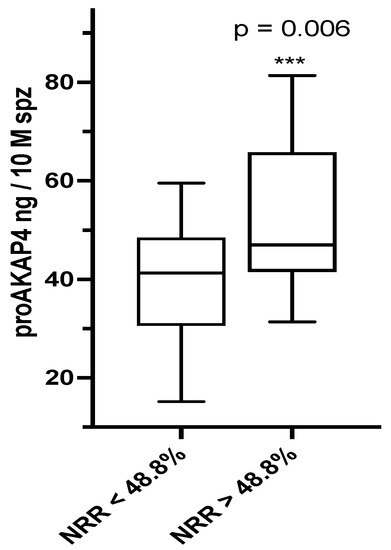 Box representation of the proAKAP4 average concentrations in post-thawed straws that gave a NRR% at 90 days over or below the threshold of 48.8%. NRR: non-return rate at 90 days post insemination and proAKAP4 concentration as a ng per 10 million of spermatozoa (ng/10 M spz). n = 199, 100 artificial inseminations. *** means significant differences (p = 0.006).