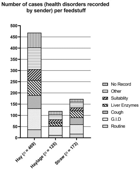 It could not be shown that deviations in microbiological quality occurred more often in feedstuffs suspected of having caused gastrointestinal disorders. Meyer et al. [] reported that “[…]after feeding mold-infested hay, disturbances in the digestive and respiratory tracts were almost regularly mentioned […]”. The data included 133 reports of roughage samples, 30 of which were objected regarding mold counts. In 6 of these 30 cases, the samples were submitted due to gastrointestinal disorders, and in one case, due to respiratory disorders. Meyer et al. [] used an orientation value of 104 colony-forming units per gram of feed for molds. In the present study, the VDLUFA orientation values of 2 × 105 cfu/g of feed-typical and 2 × 103 cfu/g of spoilage molds were used for hay and straw, and a threshold value of 5 × 103 cfu/g of all molds for haylage. Therefore, the study findings of Meyer et al. [] can be compared with our results only to a limited extent.