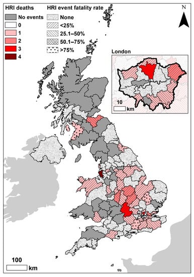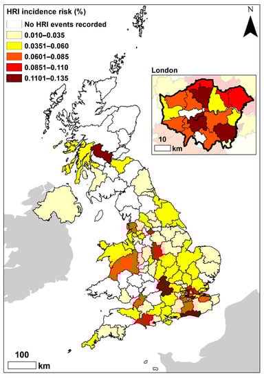 | NUTS UK Region | Population (n = 905,543) | Case Number (n = 390) | 2016 HRI Incidence (%) | Odds Ratio | 95% CI | p-Value |