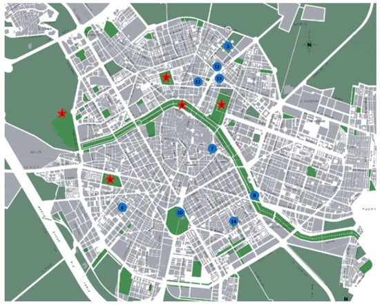 Map of the metropolitan area of Valencia, highlighting the positive (red stars) and negative (blue circles) parks to Toxocara spp. eggs. Numbers inside correspond to references to the park according to Table 1.