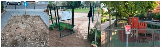 Types of studied areas. (A): canine sanitary area, (B): socialization area, (C): children’s playground.