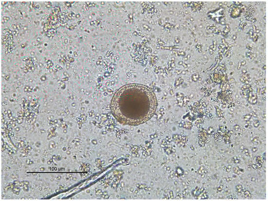 Soil samples were analyzed following a modified version of a sieving technique [,]. A measure of 100 g of sample was washed with running tap water, and each sample was sifted through four metal sieves with decreasing pore diameters (1000 µm, 250 µm, 125 µm, and 63 µm) to gradually eliminate the bigger particles. The residue in the last sieve was flushed into a 1000 mL sedimentation cup filled with water. After 20 min of sedimentation, the supernatant liquid was discarded, and the wash was repeated two more times. After the last wash, the sediment was collected into 15 mL tubes for centrifugation for 5 min at 500× g. The supernatant was discarded, and then 10 mL of zinc sulphate solution (specific gravity 1.2 g/cm3) were added to each tube, vortexed, and centrifuged for 5 min at 500× g. Finally, tubes were filled with the same solution to form a positive meniscus and a coverslip was placed on it. After 15 min, samples were examined with an optical microscope. In both coprological and soil analysis, samples were classified as positive or negative, but only samples with viable eggs were considered positive []. Due to the close similarity between eggs of Toxocara canis and T. cati, no attempt was made to differentiate between them.