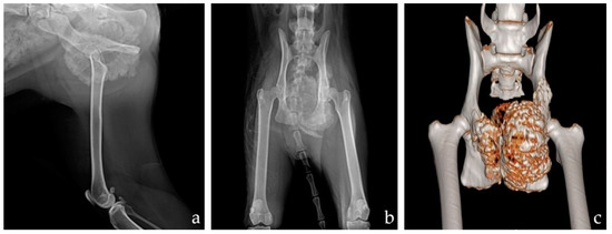 Pre-operative mediolateral radiographs of the left hind limb (a) and ventrodorsal pelvic radiographs (b). 3D reconstruction image after CT (c). There was a 4.5 × 3 × 5.4 cm mass expanding from the ischium to the ilium with a spiculated periosteal reaction.
