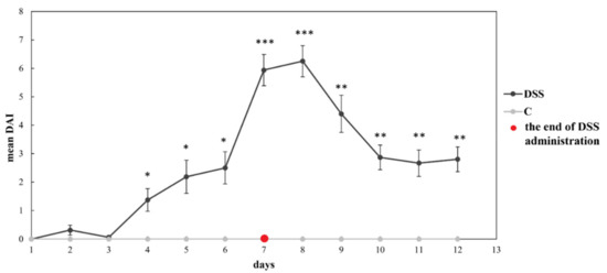 - Gaudio, E.; Taddei, G.; Vetuschi, A.; Sferra, R.; Frieri, G.; Ricciardi, G.; Caprilli, R. Dextran sulphate sodium (DSS) colitis in rats: Clinical, structural, and ultrastructural aspects. Dig. Dis. Sci. 1999, 44, 1458–1475. [Google Scholar] [CrossRef]