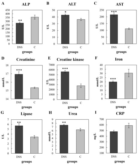 - Bilski, J.; Mazur-Bialy, A.; Wojcik, D.; Zahradnik-Bilska, J.; Brzozowski, B.; Magierowski, M.; Mach, T.; Magierowska, K.; Brzozowski, T. The Role of Intestinal Alkaline Phosphatase in Inflammatory Disorders of Gastrointestinal Tract. Mediat. Inflamm. 2017, 2017, 9074601. [Google Scholar] [CrossRef]