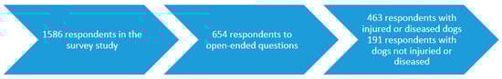 There were 1586 dogs included in the survey study. Six-hundred and fifty four respondents provided textual data in response to two open-ended questions. Among the respondents, there were 463 reporting injury or disease in their dog, whereas 191 reported no injury or disease (Figure 1). On average, 23 words were used by the respondents answering the questions. Content analysis led to the development of two categories embracing seven subcategories, with 26 codes being identified from the data (Table 1). To enhance the credibility of the analysis, quotations are presented in the text and the analytic track for each assigned category, subcategory and code is presented (Table 1).