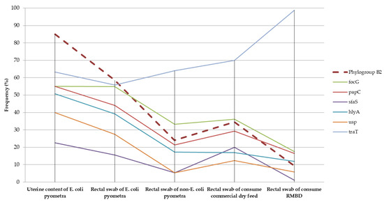 Although the intestinal ascension of E. coli strains is currently the most accepted hypothesis in the pathogenesis of canine pyometra [1,2,7], no studies have evaluated the influence of the dog diet on the specific colonization of ExPEC strains. In the last decade, an increasing number of owners have been feeding their dogs and cats raw meat-based diets (RMBDs), instead of regular commercial dry feed [19]. Dogs fed an RMBD shed an increased amount of some pathogens in their feces, including Salmonella spp. and diarrheagenic E. coli [19,20,21]. However, specific virulence factors related to extraintestinal infections have not yet been investigated. The aim of this study was to determine the prevalence of phylogroups and virulence factors in E. coli isolates obtained from the uterine contents and feces of bitches with pyometra infection. In addition, we compared these E. coli isolates with those obtained from the feces of healthy dogs fed commercial dry feed or an RMBD to evaluate the possible influence of diet on colonization by E. coli strains.