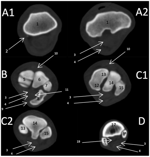 Cross-sectional computed tomographic scan of the carpal joint in donkeys. (A1) (1) Radius. (2) Ulna. (A2) (3) Deep digital flexor tendon. (4) Superficial digital flexor tendon. (B) (5) Radiocarpal bone. (6) Intermediate carpal bone. (7) Ulnar carpal bone. (8) Addition carpal bone. (9) Palmar carpal ligament. (10) Common digital extensor tendon. (11) Carpal canal. (C1) (12) First carpal bone. (13) Second carpal bone. (14) Third carpal bone. (15) Fourth carpal bone. (C2) (8) Second carpal bone. (9) Third carpal bone. (10) Fourth carpal bone. (D) (16) Fourth metacarpal. (17) Third metacarpal bone with the small bone cysts. (18) Second metacarpal bone with the small bone cysts. (19) Suspensory ligament.