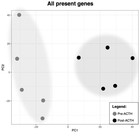 Quality control of RNA-seq, as well as sample homogeneity and clustering were performed with the CountQC app provided in the SUSHI framework. Samples showed a high homogeneity within each group, and a treatment-dependent clustering of samples was obtained (Supplemental Figure S1A). This was further supported by the principal component analysis (PCA) plot for all genes identified (Figure 1). In this analysis, the distribution of samples in the principal component (PC) 1 was segregated by treatment. Furthermore, in the PC2, samples from the Post-ACTH group appeared to present a higher homogeneity than those from the Pre-ACTH group.