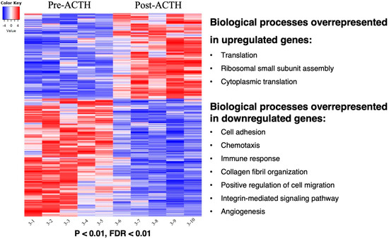 Heatmap of the 1190 differentially expressed genes (DEGs) in response to ACTH treatment and related functional terms analysis. Gradient of expression of each gene relative to its average expression is represented by colors red (high) to blue (low). 499 genes were upregulated in visceral adipose tissue (VAT) of animals after ACTH treatment whereas 691 genes were downregulated in samples before ACTH treatment (p < 0.01, FDR < 0.01). Main significant overrepresented gene ontologies (biological processes) identified with DAVID analysis in each group of genes are presented. The entire list of DEGs and details of functional terms can be found in Supplemental Files S1 and S2, respectively.