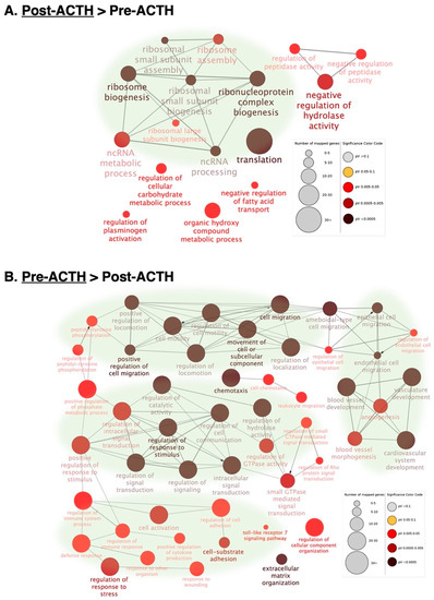 Functional networks as determined by ClueGO (Cytoscape) found in differentially expressed genes (DEGs) affected by ACTH treatment. Overrepresented functional terms are shown for genes upregulated (A) and downregulated (B) after ACTH treatment. Redundant and/or noninformative terms were removed and obtained networks were rearranged manually. Node size indicates number of mapped genes and level of enhancement is denoted by node color (represented in figure legend). Networks more highly represented after treatment were related to transcription whereas networks related to cell motility, vascularization, cell–cell communication and intracellular signaling, immune signaling and extracellular matrix were more highly represented in samples from the pre-treatment group. The list of representative genes included in different nodes and statistical details are listed in Supplemental File S2.