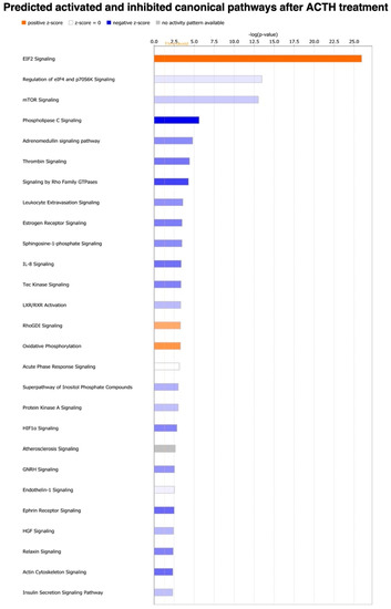 Among the top upstream regulators predicted by the IPA software to affect the expression of the DEGs were factors such as the La ribonucleoprotein 1 translational regulator (LARP1, p = 1.62 × 10−43), tumor necrosis factor (TNF, p = 2.51 × 10−28), C-C motif chemokine receptor 2 (CCR2, p = 6.91 × 10−15), estrogen receptor 1/alpha (ESR1, p = 4.12 × 10−14) and interferon gamma (IFNG, p = 9.69 × 10−15), all predicted to be inhibited by treatment (Supplemental File S2). In contrast, dexamethasone (p = 2.28 × 10−32) was predicted to be activated after ACTH treatment (Supplemental File S2). Finally, no prediction of activation could be achieved for transforming growth factor 1 beta (TGFB1, p = 3.64 × 10−28), β-estradiol (p = 5.97 × 10−27), interleukin 1 beta (IL1B, p = 1.34 × 10−14) and fibroblast growth factor 2 (FGF2, p = 2.75 × 10−14) (Supplemental File S2).