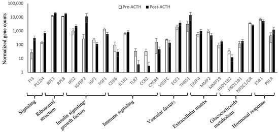 Functional analysis highlighted the presence of different biological mechanisms modulated by ACTH treatment. As further evaluation of mRNA amounts (e.g., with semi-quantitative PCR) was not possible in the present work (discussed below), further exploration of the expression patterns of representative DEGs for different functional groups was performed based on normalized gene counts (p and FDR < 0.01, Figure 5). In response to treatment, genes involved in intracellular signaling (peptidase inhibitor 3, PI3; phospholipase C delta 4, PLCD4), in ribosomal structure (such as the ribosomal protein L, RPL, -3 and -8), and the insulin receptor substrate 2 (IRS2) and insulin-like growth factor binding protein 2 (IGFBP2) presented significantly higher normalized counts than in the control samples. In contrast, growth factors, such as insulin-like growth factor 1 (IGF1) and fibroblast growth factor 1 (FGF1), presented lower normalized counts. With regard to the immune system, whereas the expression of the interleukin 1 receptor type 1 (IL1R1) was increased, the cluster of differentiation 86 (CD86), toll-like receptor 7 (TLR7), CCR2 and C-X-C motif chemokine receptor 4 (CXCR4) presented lower counts in response to ACTH. The number of replicates from vascular endothelial growth factor C (VEGFC) and of matrix metalloproteinase (MMP) -2 was lower in ACTH-treated dogs, contrasting with increased amounts of endothelin converting enzyme 1 (ECE1), thrombospondin 1 (THBS1), tissue inhibitor of metallopeptidase 4 (TIMP4) and MMP19. Regarding the metabolism of glucocorticoids, hydroxysteroid 11-beta dehydrogenase (HSD11B) -2 and glucocorticoid receptor (NR3C1/GR) availability were reduced by treatment, contrasting with increased availability of HSD11B1. Finally, whereas the availability of ESR1 was decreased in hypercortisolemia, prolactin receptor (PRLR) availability was increased.