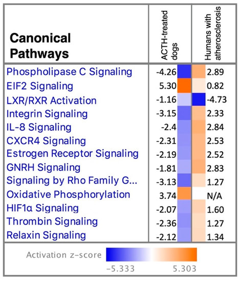 Main selected canonical pathways enriched in visceral adipose tissue (VAT) of ACTH-treated dogs detected in the present study and of humans presenting with atherosclerosis. The analysis match feature from the IPA software was used to compare enriched pathways in the transcriptome of VAT of dogs treated with ACTH (induced Cushing’s syndrome) with enriched pathways in the microarray of VAT of humans presenting with atherosclerosis [30]. Presented pathways were ranked according to Z-score. The predicted activity pattern of each given pathway is indicated by color (as defined in figure legend) and follows the calculated Z-score (positive Z-score indicates activation while negative Z-score relates to predicted deactivation of canonical pathway). Generally, an inverse predicted behavior of presented pathways was observed between the compared analyses.