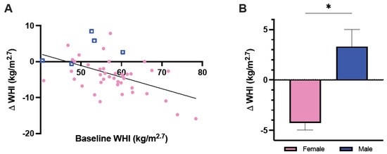 Effect of baseline weight-for-height index (WHI) (A) and sex (B) on delta WHI in full-grown adult male and female long-tailed macaques. Note that the y-axes are not equally scaled. Circles represent females; squares represent males. Error bars represent the standard error. * p < 0.05.