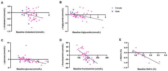 Effect of baseline value on delta cholesterol (A), delta triglyceride (B), delta glucose (C), delta fructosamine (D), and delta HbA1c (E) in full-grown adult male and female long-tailed macaques. Circles represent females; squares represent males.