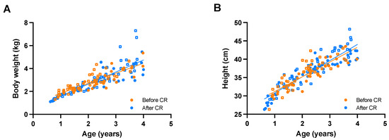 Similarly, height of immatures was independent of sex (F(1,148) = 0.418, p = 0.519) and CR (F(1,148) = 0.0270, p = 0.604; Figure 3B), but increased with age (F(1,148) = 768.054, p < 0.0005). On average, height increased with 4.2 cm per year. There was again a significant interaction effect between age and sex (F(1,148) = 4.133, p = 0.044). The regression equations showed that male height = 26.27 + 4.73 × age, while female height = 27.1 + 3.85 × age (Figure A1). Thus, the age–sex interaction effects show that male immatures have a higher increase in body weight and height per year compared to female immatures, meaning males grow faster than females, while CR had no significant effect on immature growth.