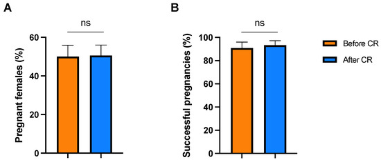 Proportion of pregnant females (A) and successful pregnancies (B) in a long-tailed macaque breeding colony before and after caloric restriction (CR). Error bars represent the standard error. ns: p ≥ 0.05.