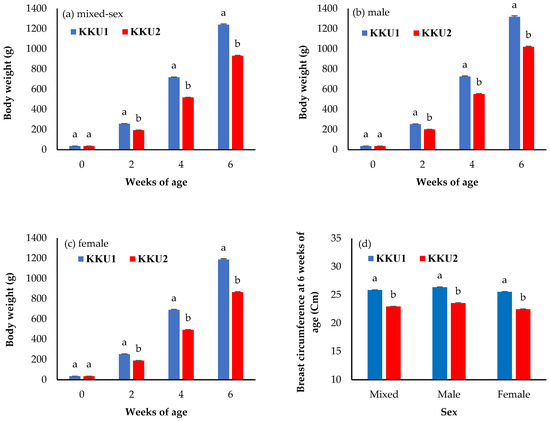 Least square means ± standard error of (a) the body weight of the mixed-sex chickens (birth weight (0), 2, 4, and 6 weeks of age), (b) body weight of the males (birth weight (0), 2, 4, and 6 weeks of age), (c) body weight of the females (birth weight (0), 2, 4, and 6 weeks of age), and (d) breast circumference at 6 weeks of age of the mixed-sex, male, and female chickens. KKU1 = crossbred chicken between commercial broiler and Thai indigenous synthetic chickens (Kaimook e-san1); KKU2 = crossbred chicken between Kaimook e-san2 and Kaimook e-san1 (both of which are Thai indigenous synthetic chickens). Means for the same trait with different letters (a,b) differ significantly (p < 0.05).