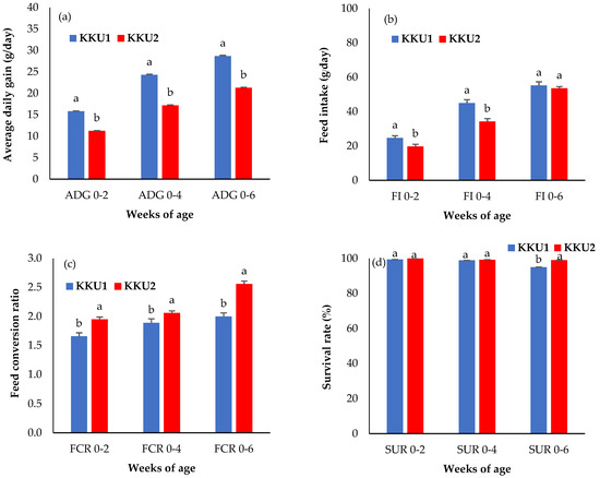 Least square means ± standard error of (a) the average daily gain (ADG0–2, ADG0–4, and ADG0–6), (b) feed intake (FI0–2, FI0–4, and FI0–6), (c) feed conversion ratio (FCR0–2, FCR0–4, and FCR0–6), and (d) survival rate (SUR0–2, SUR0–4, and SUR0–6). KKU1 = crossbred chicken between commercial broiler and Thai indigenous synthetic chickens (Kaimook e-san1); KKU2 = crossbred chicken between Kaimook e-san2 and Kaimook e-san1 (both of which are Thai indigenous synthetic chickens). Means for the same trait with different letters (a,b) differ significantly (p < 0.05).