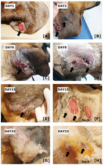 Clinical Features of the Present Case. (A) At the initial presentation, ulcerated nodules on the right ear were seen. (B) On day two, another lesion with ulceration was observed on the right pinna. (C) On day 6, the ulcerative lesions on right pinna have enlarged, (D) and ulcerations with fistulous tract were observed on the neck. (E) After administration of meropenem and doxycycline, the ulcerations on right pinna have gradually resolved on day 15. (F) However, the ulcerations on the neck were still observed. (G) On day 33, the skin lesions on the right pinna were resolved and show hair regeneration. (H) Ulcerative lesions on the neck also show skin regeneration. Arrows indicate skin lesions.