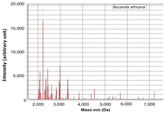 The culture colonies of serosanguinous discharge of ulcerated lesions were further investigated by MALDI-TOF mass spectrometry. The intensity of the specimen showed 99% of confidence value with N. africana.
