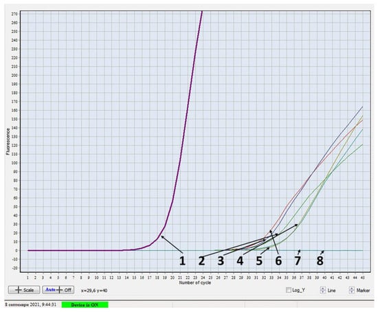 Results of six samples from cats by using real-time RT-PCR 1−positive control; 2−7−samples from cats with respiratory symptoms; 8−negative control.