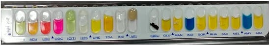 In total, 56 out of 120 samples indicated that their farms were positive for E. coli, with a recovery percentage of 46.7%. The E. coli isolates were accounted for from the pooled internal organs (heart, liver, lung and spleen) of ill broiler chickens gathered from poultry farms located in the Giza, Dakahlia and Sharqia governorates from October 2019 to October 2020. On MacConkey agar, the suspected colonies were 1–2 mm in diameter and of a hot-pink color, whereas on eosin methylene blue agar, they had a metallic color and sheen. One pure colony from each positive sample was further biochemically identified. The isolates demonstrated acidic slant with gas production bottom on TSI, positive reaction for catalase, indole and methyl red while negative for oxidase, VP and citrate production tests, with the biochemical profiles obtained via the API 20E system, as displayed in Figure 1.