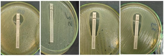 Upon examination of 56 E. coli isolates using Colistin Ezy MIC strip (CL) (0.016–256 µg/mL), only 14 isolates displayed resistance to colistin (MIC ≥ 4 µg/mL) with a percentage of 25% or greater ( Figure 2).