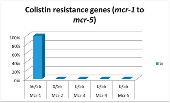 All 56 E. coli isolates were positive only for the mcr-1 gene and negative for the rest of the colistin-resistance genes, as shown in Figure 3.
