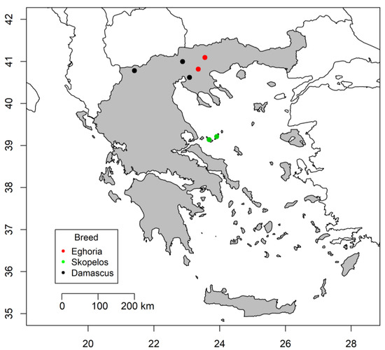 A total of 1210 dairy goats of two indigenous Greek breeds (Eghoria, n = 418 and Skopelos, n = 429) and one imported breed (Damascus, n = 363) were used. Animals were randomly selected from seven farms (two with Eghoria, two with Skopelos, and three with Damascus goats) located in northern and central Greece (Figure 1). All herds were selected as representatives of the studied breeds and the low-input pastoral farming system, the typical goat production system in Greece [24]. This system is characterised by grazing shrubland and woodland areas throughout the year, traditional management practices, and random mating of animals.