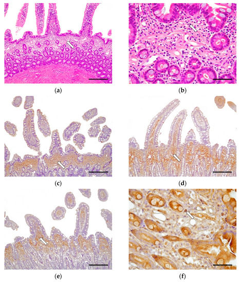 Half of the cases (8/16, 50.0%) were classified as grade I, which is histologically compatible with CEE. In 6/8 cases (75.0%), the disease affected the whole of the small intestine; in 1/8 cases (12.5%) there were lesions in the duodenum and jejunum; and in 1/8 cases (12.5%) there were lesions just in the duodenum. These cases were characterized by multifocal mucosal fibrosis (Figure 1). The morphological changes in grade I (CEE) cases included moderate villus stunting, mild to moderate distension of the crypts, and moderate lymphangiectasia. Minimally to mildly reactive fibroblasts and multifocal areas of fibrosis of the lamina propria were observed. Such a lesion was characterized by the formation of a discontinuous band of fibrous connective tissue immediately beneath the villi, producing a marked separation of the villus–crypt junction, displacing the glandular crypts down from the lamina propria (Figure 1a,b). There was an absence of epithelial injury and necrosis. The morphological diagnosis in these cases was of moderate, chronic, diffuse, eosinophilic. and lymphoplasmacytic enteritis affecting one intestinal layer (mainly the lamina propria in the mucosa). Neutrophils were minimal, and macrophages and intraepithelial lymphocytes were scarce.
