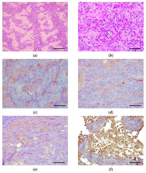 Feline Eosinophilic Gastrointestinal Sclerosing Fibroplasia (Grade II). Cat, duodenum, case No. 13. (a) Abundant collagen bands (arrow) surround a large number of proliferating fibroblasts and eosinophils (arrowhead). Hematoxylin–eosin. Scale bar: 400 μm (b) Large number of proliferating fibroblasts (arrowhead) and eosinophils (arrow). Hematoxylin–eosin. Scale bar: 100 μm. (c) Moderate fibrillar collagen I immunoexpression is observed in the collagen bands large number of proliferating fibroblasts and eosinophils (arrow), located at the level of the submucosa and muscular layers. Rabbit polyclonal anti-collagen I. Scale bar: 200 μm. (d) Moderate collagen III immunoexpression in the collagen bands and around the fibroblasts (arrow), located in the submucosa and the muscular layers. Rabbit polyclonal anti-collagen III. Scale bar: 200 μm. (e) Moderate diffuse immunoexpression is observed around proliferating fibroblasts (arrow) in the submucosa and the muscular layers. Rabbit polyclonal anti-fibronectin. Scale bar: 200 μm. (f) Intense diffuse TGF-β1 cytoplasmic immunoexpression in fibroblasts and mononuclear cells between the collagen bands (arrow), in the submucosa, and muscular layers. Rabbit polyclonal anti-TGF-β1. Scale bar: 100 μm.