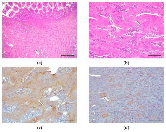 Feline Eosinophilic Gastrointestinal Sclerosing Fibroplasia (Grade III). Cat, du4odenum, case No. 16. (a). Dense collagen bands (arrow) occupying the lamina propria, submucosa, and muscular layer. Hematoxylin–eosin. Scale bar: 400 μm. (b) These bands (arrow) are surrounded by a mild to moderate number of fibroblasts and eosinophils (arrowhead). Hematoxylin–eosin. Scale bar: 100 μm. (c) Intense fibrillar collagen I immunoexpression in the dense bands (arrow) in the submucosa, muscular, and serosa layers. Rabbit polyclonal anti-collagen I. Scale bar: 200 μm. (d) Negative immunoexpression against collagen III is observed at the fibrotic bands, immunoexpressed only at the perivascular level (arrow) without affecting the sclerosing connective tissue. Rabbit polyclonal anti-collagen III. Scale bar: 200 μm. (e). Intense fibronectin immunoexpression in fibroblasts (arrow) in the submucosa and muscular layers. Rabbit polyclonal anti-fibronectin. Scale bar: 200 μm. (f). Moderate cytoplasmic TGF-β1 immunoexpression in fibroblasts and mononuclear cells (arrow), between the collagen bands as well as in the submucosa and muscularis. Rabbit polyclonal anti-TGF-β1. Scale bar: 100 μm.