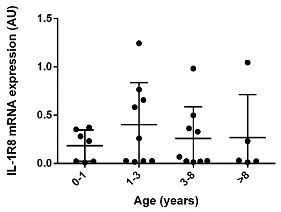 An association was uncovered between IL-1R8 expression level and dog breed, which could be related to specific polymorphisms of the gene in different populations of dogs [36,37].