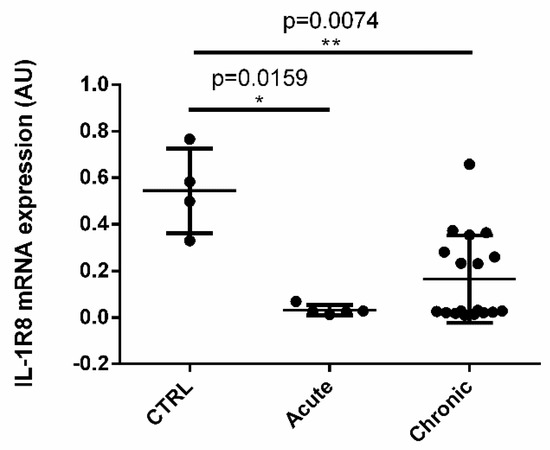 Dogs enrolled in the study were divided in groups based on the clinical condition: control (4 dogs), acute inflammation (5 dogs; clinical signs present since less than three weeks), chronic inflammation (21 dogs; clinical signs present since more than three weeks) [2]. We observed a significant downregulation of the expression of IL-1R8 mRNA in acute and chronic inflamed samples compared to controls (Figure 2).