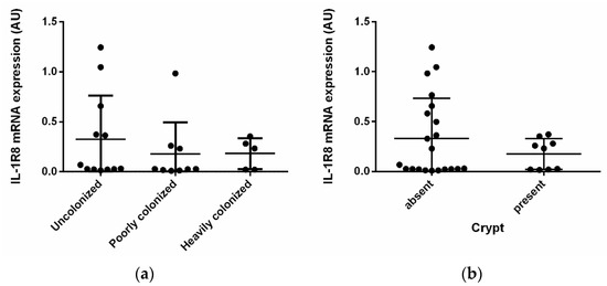 Samples were classified into three classes (i.e., heavily colonized, poorly colonized, and uncolonized biopsies) according to their Helicobacter spp. colonization status based on PCR and immunohistochemical results as previously described [30]. The expression of IL-1R8 resulted gradually reduced from uncolonized to poorly colonized and to highly colonized samples (Figure 3a), although the difference was not statistically significant. This seems to be confirmed by the downregulation of IL-1R8 mRNA in samples with bacteria infiltration into the crypts (Figure 3b; not statistically significant) and significant negative correlation between IL-1R8 and colonization or PCR positivity for Helicobacter (Table 2).
