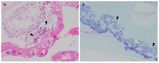 Light microscopy images of the ileum (A) and rectum (B) of workers infected with C. acanthocephali: (A) longitudinal section (40×) of the ileum stained with hematoxylin and eosin (H&E), in which trypanosomatid clusters could be observed (arrowheads); (B) methylene blue-stained longitudinal semi-thin section (20×) of the rectum, covered by a layer of trypanosomatid cells (arrowheads).