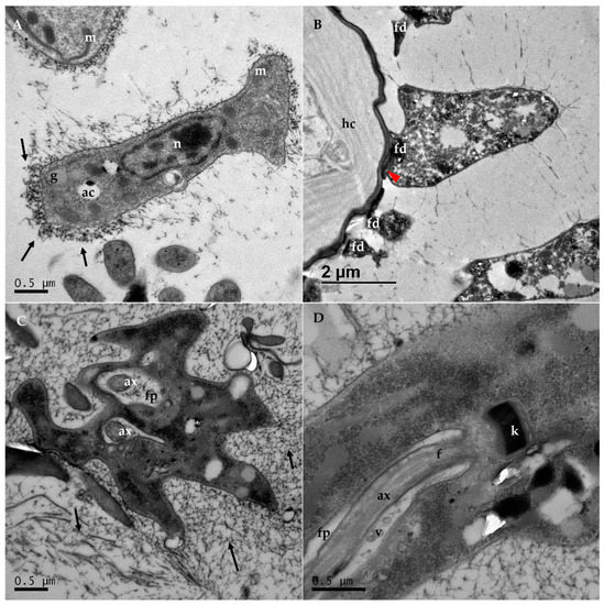 Transmission electron microscopy (TEM) images obtained from the rectum of C. acanthocephali infected bees: (A) longitudinal section of an adherent haptomonad form, with the elongated nucleus (n) visible on the central part of the cell body, with condensed heterochromatin both centrally and around the nuclear membrane, as well as some organelles as acidocalcisomes (ac) and glycosomes (g). A network of fibers of unknown nature can be observed around the trypanosomatid, especially in the posterior part of the cell (black arrows). (B) Haptomonad cell attached to the host cell (hc). Some flagellapodia (fd) that remain attached could also be observed, even though their cell bodies seem to be lost or are not in the same section. (C) Cross-section of a haptomonad cell undergoing division, in which two flagella axonemes (ax) can be observed inside both flagellar pockets. (D) Detailed longitudinal section of a haptomonad cell. The flagellar body (f), with the axoneme visible (ax), is located within half of the length of the cell body, right before the kinetoplast (k). Some vesicles (v) are observed inside the flagellar pocket, while other organelles, such as the mitochondria (m), are also observed in the cell body.