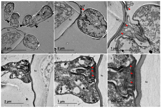 Transmission electron microscopy (TEM) images obtained from the rectum of C. acanthocephali infected bees: (A) longitudinal section that shows different phases of the attachment process, including haptomonads adhered to the host cell (hc) and non-attached trypanosomatids with their flagella (f) oriented to the host surface (black arrowheads). (B,C) Details of the haptomonad cells and its flagellopodium (fd), which is surrounded by the flagellar pocket (fp) and is held together with the cell body through the type A desmosomes (white arrowheads). Hemidesmosome-like complexes are observed between the flagellopodium and the host surface (electron-dense material underneath the attachment pad: red arrowheads), while an array of filaments reinforce the entire complex (asterisk). Some organelles could be observed inside the trypanosomatids, such as the nucleus (n) and the mitochondria (m). (D) Haptomonad attached to the cuticular layer of the honey bee epithelial cells (hc), with the axoneme (ax) visible at the base of the flagellopodium (fd). (E,F) Details of the flagellopodium (fd), where type A desmosomes (white arrowheads) and the hemidesmosome-like complexes (red arrowheads) could be observed.