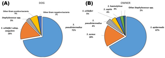 Bacterial isolation and identification from dogs with superficial pyoderma (A) and their owner (B).