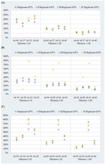 Results obtained from gE indirect ELISA expressed as S/P (positive-to-control ratio); (A) Weak reactivity positive samples, diluted at 1:10, 1:20, and 1:40, assayed in four replicates; (B) Medium reactivity positive samples, diluted at 1:10, 1:20, and 1:40, assayed in four replicates; (C) Strong reactivity positive samples, diluted at 1:10, 1:20, and 1:40, assayed in four replicates.