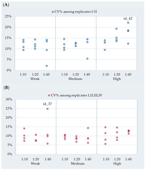 (A) Within-run coefficient of variability (CV%) among replicates I–II performed on each positive reference sample per reactivity level and dilution ratio. (B) Between-run coefficient of variability (CV%) among replicates I–IV performed on each positive reference sample per reactivity level and dilution ratio. For each reactivity group and dilution, there are four dots. Each dot represents the CV% among the replicates, performed on a single positive reference sample belonging to that reactivity level and originating from that dilution. The highest values of CV% were labelled as follows to aid communication: the CV% of a 1:40 diluted id-42 individual milk and the CV% of a 1:40 diluted id-37 individual milk.