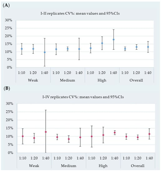 The between-run repeatability for each reactivity level and dilution did not exceed 16.4%, except for weakly reactive samples at a 1:40 dilution (CV%: 12.8, 95% CI: 0.0–26.1; Figure 3B). Overall, the between-run repeatability CV% ranged from 8% to 15% on average (1:10 dilution CV%: 9.9, 95% CI: 8.2–11.6; 1:20 dilution CV%: 9.5, 95% CI: 8.1–10.9; 1:40 dilution CV%: 11.6, 95% CI: 8.4–14.7; Figure 3B).