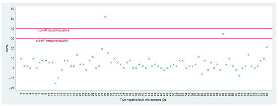 The negative reference samples comprised 80 BM samples collected from 80 different herds in northern Italy (Piedmont Region) with official IBR-free status. The farms were certified by the regional public veterinary service in 2019 under the IBR European legislation 2004/558/CEE []. Each BM sample comprised a maximum of 50 milk samples.