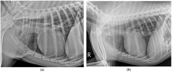 (a) Lateral thoracic X-ray at the first consultation. Note the diffuse interstitial pulmonary pattern visible in cranial and diaphragmatic lung lobes, along with a bronchial pattern in the diaphragmatic lobes and esophageal gas distension. (b) Lateral thoracic X-ray upon admission to our service (4 weeks later). The pulmonary pattern and esophageal gas distension are visible.