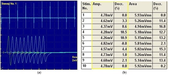 (a) Repetitive nerve stimulation test and the fatigability of the synaptic transmission. (b) There is an obvious 10% reduction in the amplitudes of the fourth compound muscle action potential compared to the first.